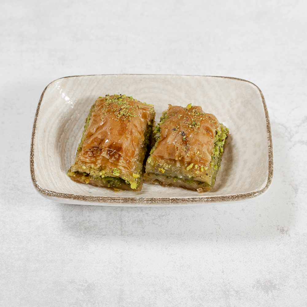 Tradycyjna baklawa z cienkiego ciasta filo, obficie i wysokiej jakości pistacjami nadziewana, doskonale zbalansowana syropem, podawana w eleganckim długim kształcie trójkąta. Thin layers of filo pastry generously filled with high-quality pistachios, perfectly balanced with sweet syrup, served in an elegant long triangle shape.