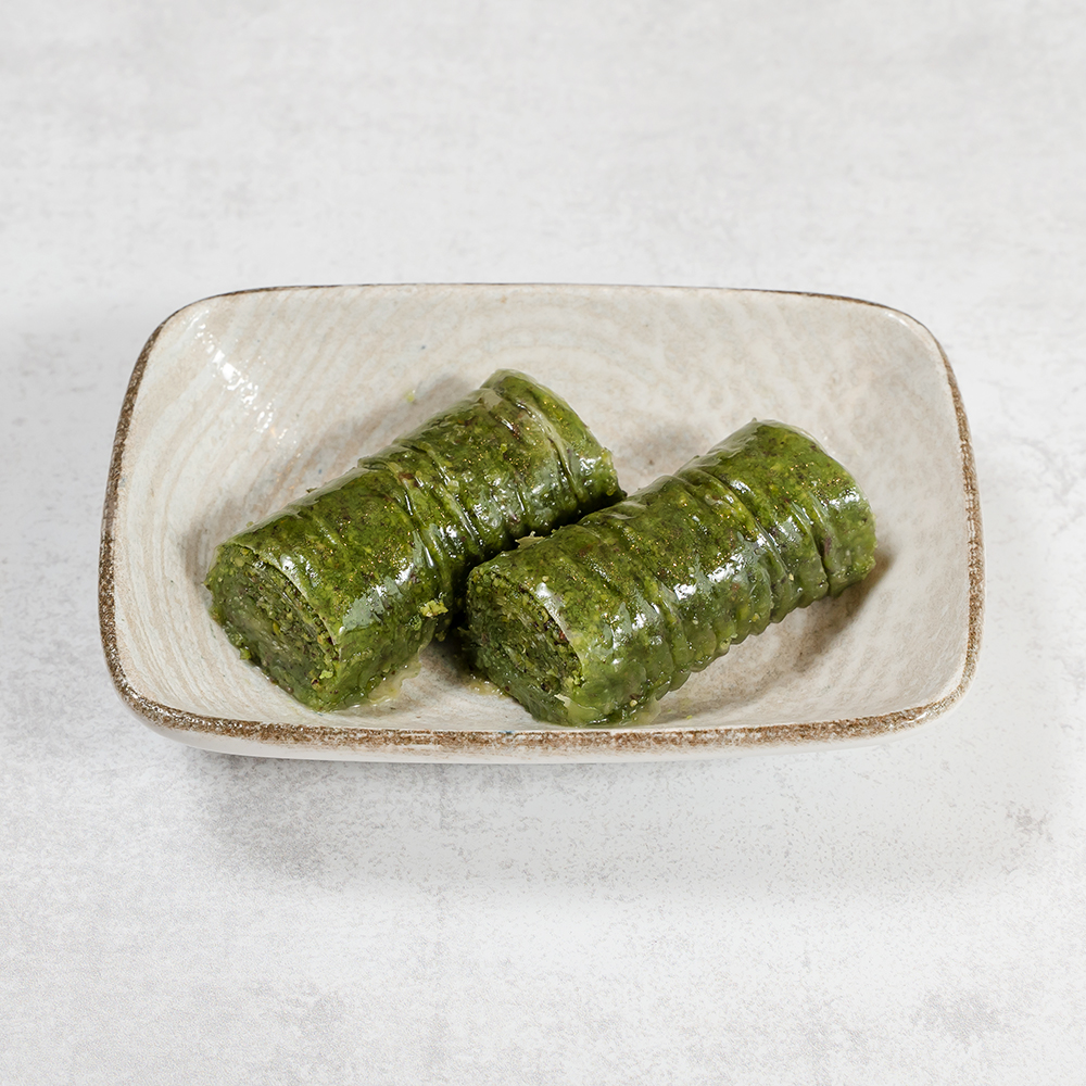 Cienkie ciasto filo zawijane z dużą ilością pistacji, nasączone słodkim syropem. Bogaty i wyjątkowy smak. A rich baklava roll made with thin layers of filo and filled generously with premium pistachios, sweetened with syrup.