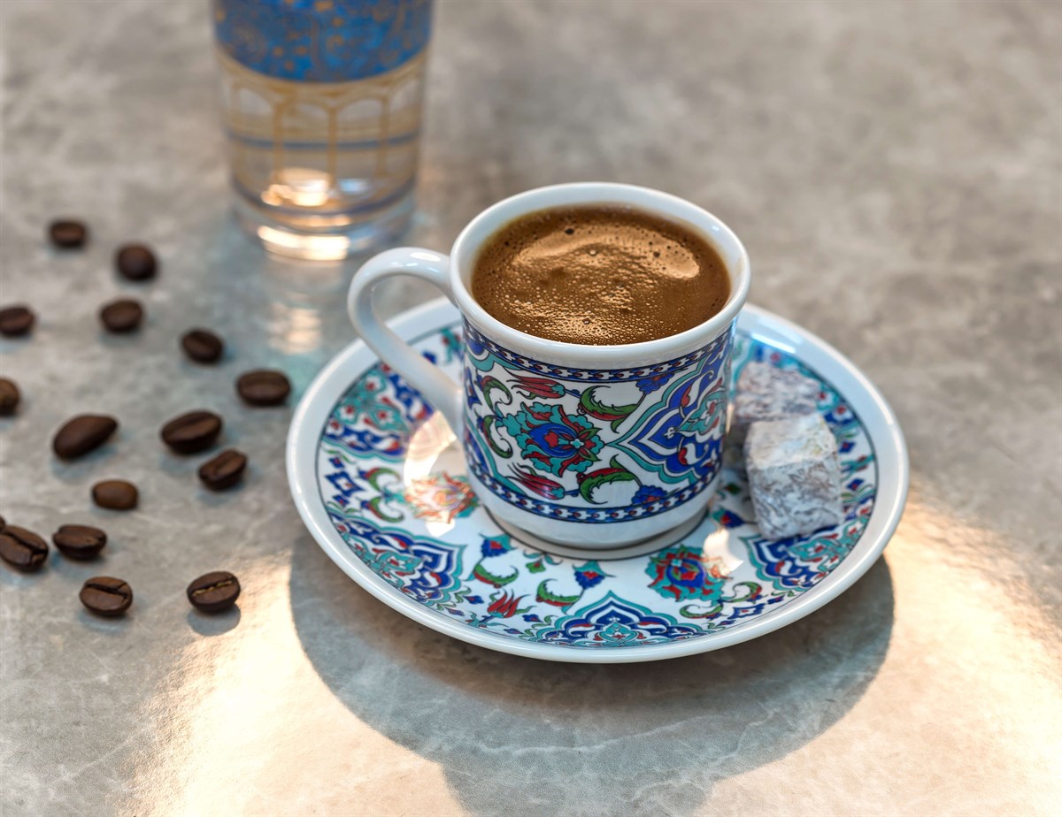 Tradycyjna kawa parzona w tygielku z drobno mielonej kawy, podawana z fusami. Aromatyczna i mocna Traditionally brewed in a cezve with finely ground coffee, served unfiltered with its grounds. Rich and aromatic